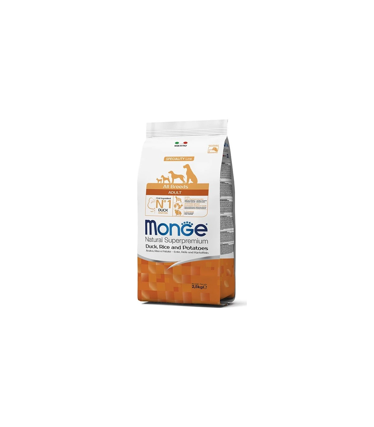 Le crocchette Monge Natural Superpremium Speciality Line Adult con Anatra, Riso e Patate sono un alimento completo e bilanciato per cani adulti di tutte le razze che necessitano di alimenti ad alta digeribilità .