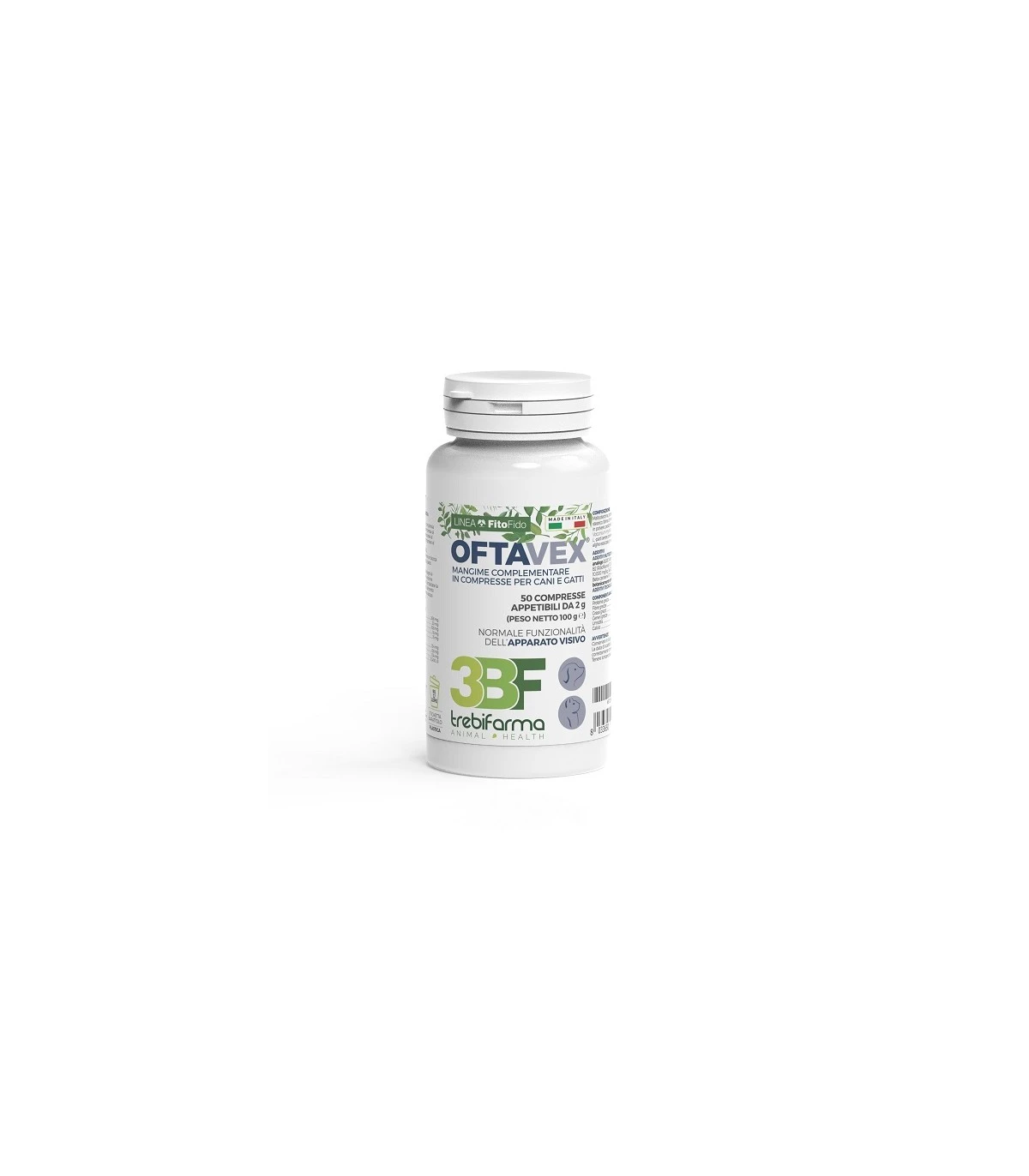Trebifarma oftavex 50 compresse 2 gr è un mangime complementare in compresse per cani e gatti indicato per favorire la normale funzionalita’ dell’ apparato visivo.